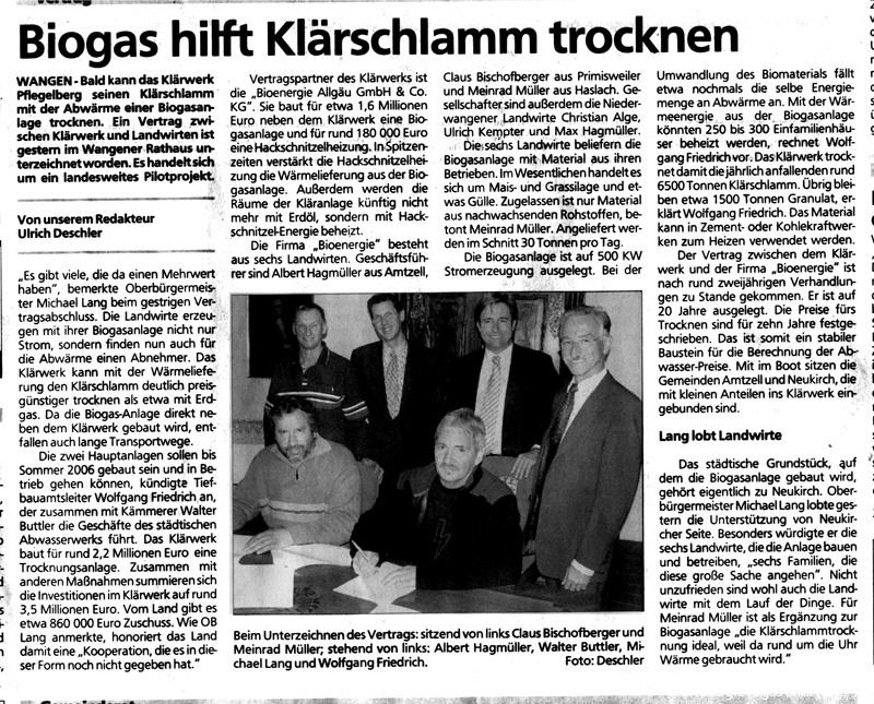 Biogas hilft Klärschlamm trocknen Bericht der "Schwäbischen Zeitung" vom 17.11.2005